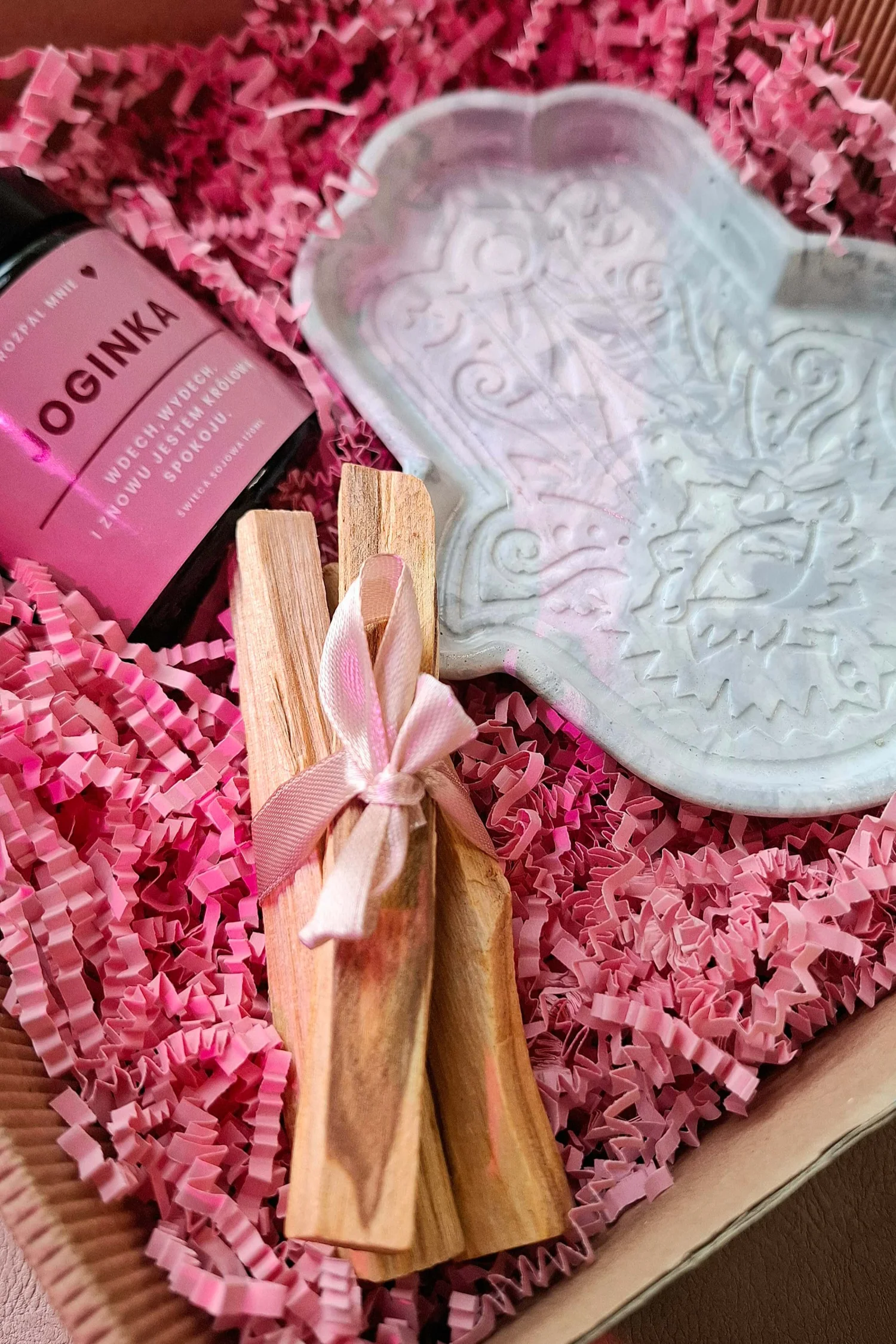 Zestaw ze świeczką zapachową, kadzidłem palo santo i podstawką na kadzidła został zapakowany w dekoracyjne, karbowane pudełko przewiązane brzoskwiniową kokardą - gotowe do wręczenia jako prezent dla kobiety.